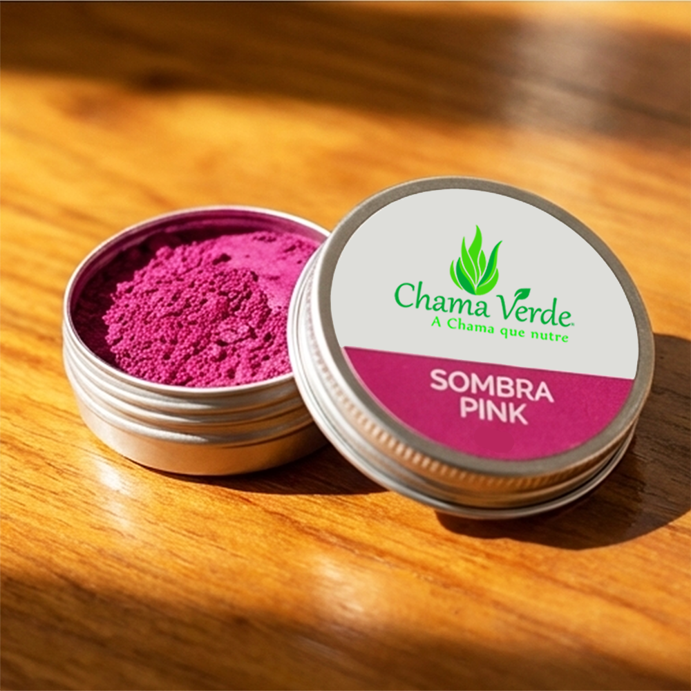 A Sombra Pink atural e Vegana da Chama Verde® é 100% Natural, vegana, feita artesanalmente com pigmentos extraídos da natureza, como araruta, pau Brasil e hematita. É fonte de micro minerais, logo, uma maquiagem nutritiva, que traz mais saúde, alegria e beleza pro seu rostinho.