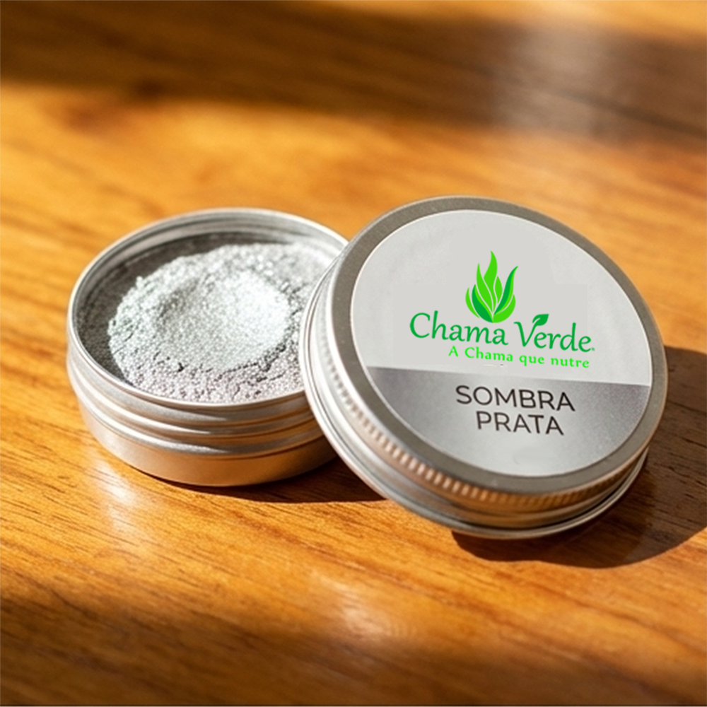 Sombra Prateadada Chama Verde® é 100% Natural, vegana, petrolatos, óleos minerais, microplásticos, aromas, chumbo ou outros metais ou corantes sintéticos.